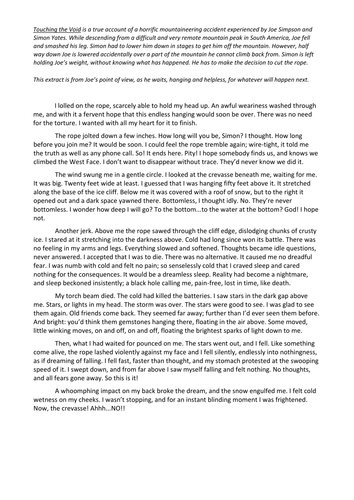 · Words 3 Pages. Touching the Void essay. In this traumatic, edgy account of 'Touching the Void' you are given two scenarios of two men in completely different mind sets as they are faced with tough choices. The writer portrays Joe full of emotion and in intense pain while Simon accepts reality and thinks logically Touching The Void Argumentative essay By reanalyzes courageous decision, cut the rope and save himself, or stay tied to Joe and both of them be pulled to their deaths. Some say Simon made the wrong decision by cutting the rope, but when in a life or death situation, makes cutting the rope the only option Touching the Void Brandon Large 9M Structure of the Film 1.a) I think that the film maker chose to use interviews and re-enactmentsbecause provides a much better engaging atmosphere for the audienceand it also provides the feeling of you actually being there and witnessingthe events that happen throughout the film.b) The advantages using this technique give to the film and the film